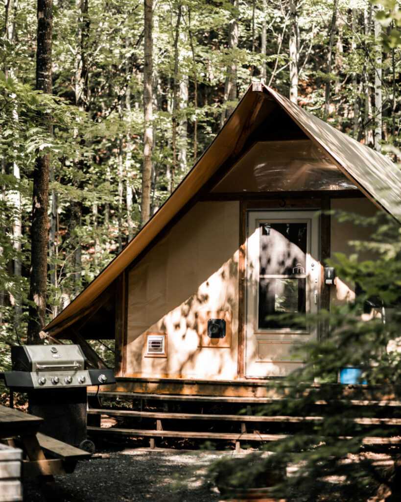 The ready-to-camp area, set back from the campground, is not accessible by car, as the only access road is narrow and sloping. However, it is less than 5 minutes from the main parking lot and amenities, as well as the playground.